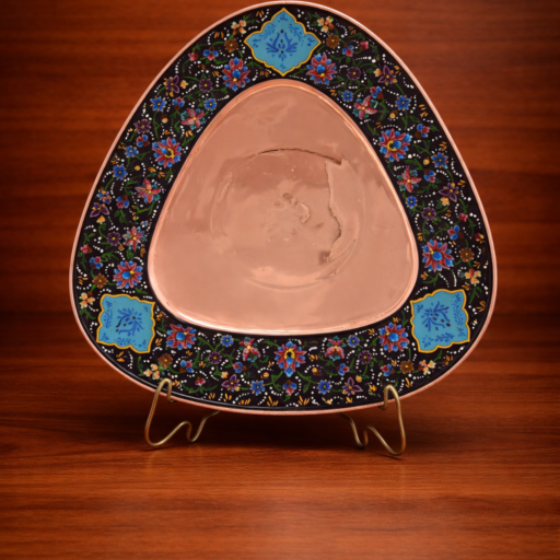 Handmade copper Minakari piece with vibrant Persian enamel detailing, blending warm metallic tones with elegant decorative artistry