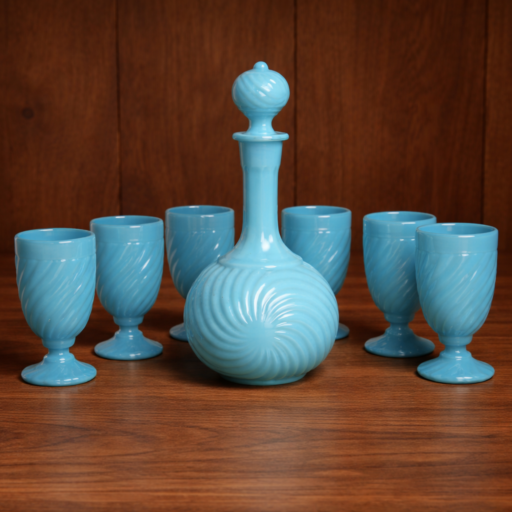 This set features a swirled decanter with an elegant knopped lid, paired with six matching tumbler goblets in vibrant opaque turquoise milk glass. Handcrafted for timeless charm, the intricate textures catch and reflect light beautifully.