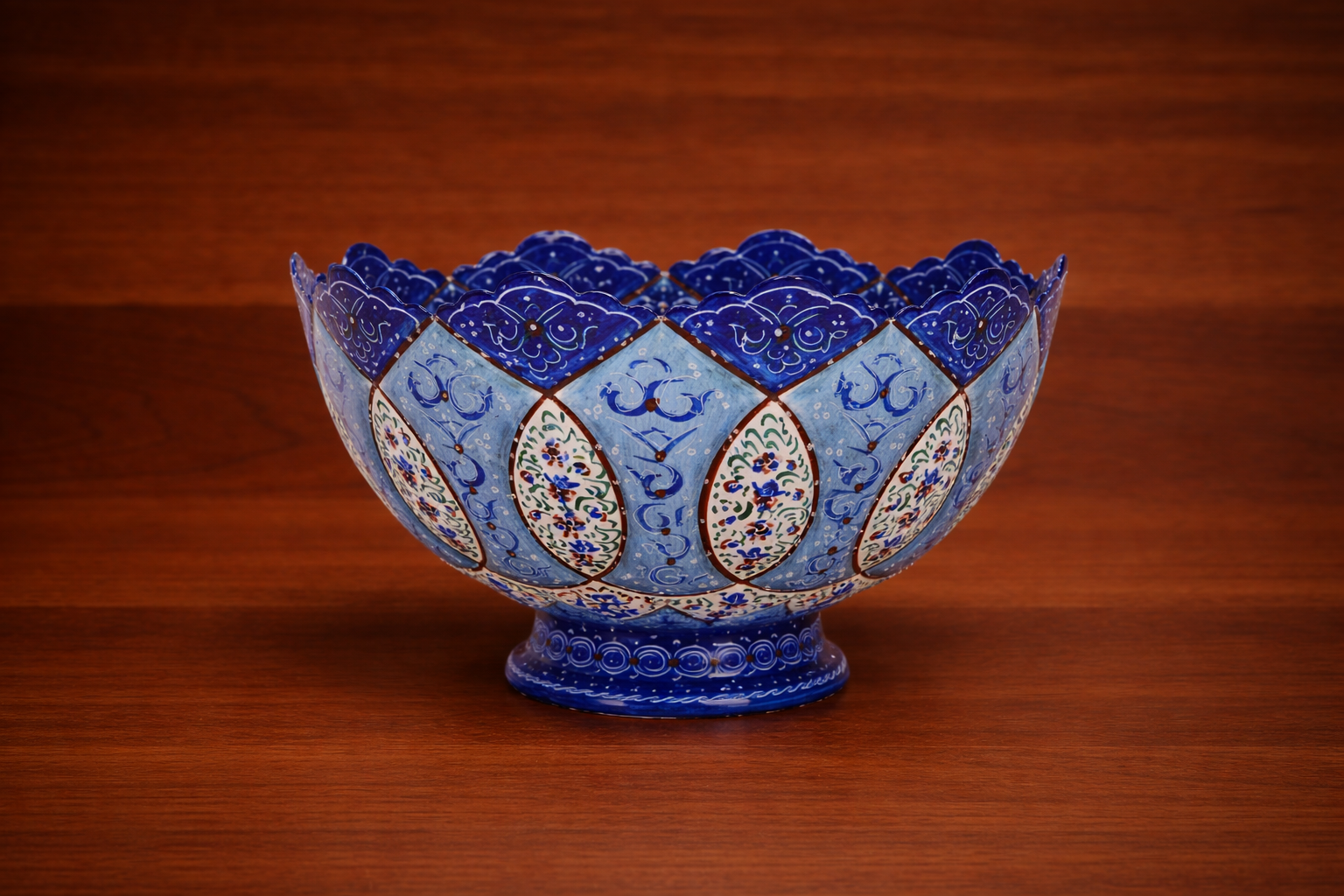 Handcrafted copper enamel bowl adorned with vibrant turquoise and blue Persian floral motifs, perfect for serving or decorative display.