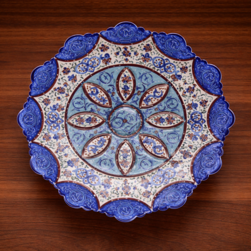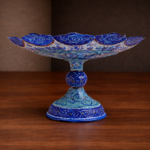 This Persian Minakari metal pedestal dish showcases the ancient art of enamel work on copper, featuring intricate floral motifs in vibrant turquoise blues and whites. Handcrafted with a scalloped rim and ornate pedestal base, it serves as both a stunning decorative centerpiece and functional dish for fruits or sweets.