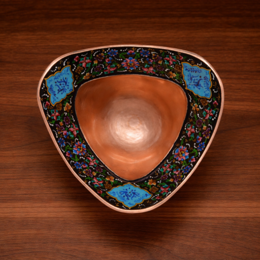 Handmade Minakari enamel copper candy bowl with vibrant Persian floral motifs, perfect for serving sweets or as an elegant decorative accent.