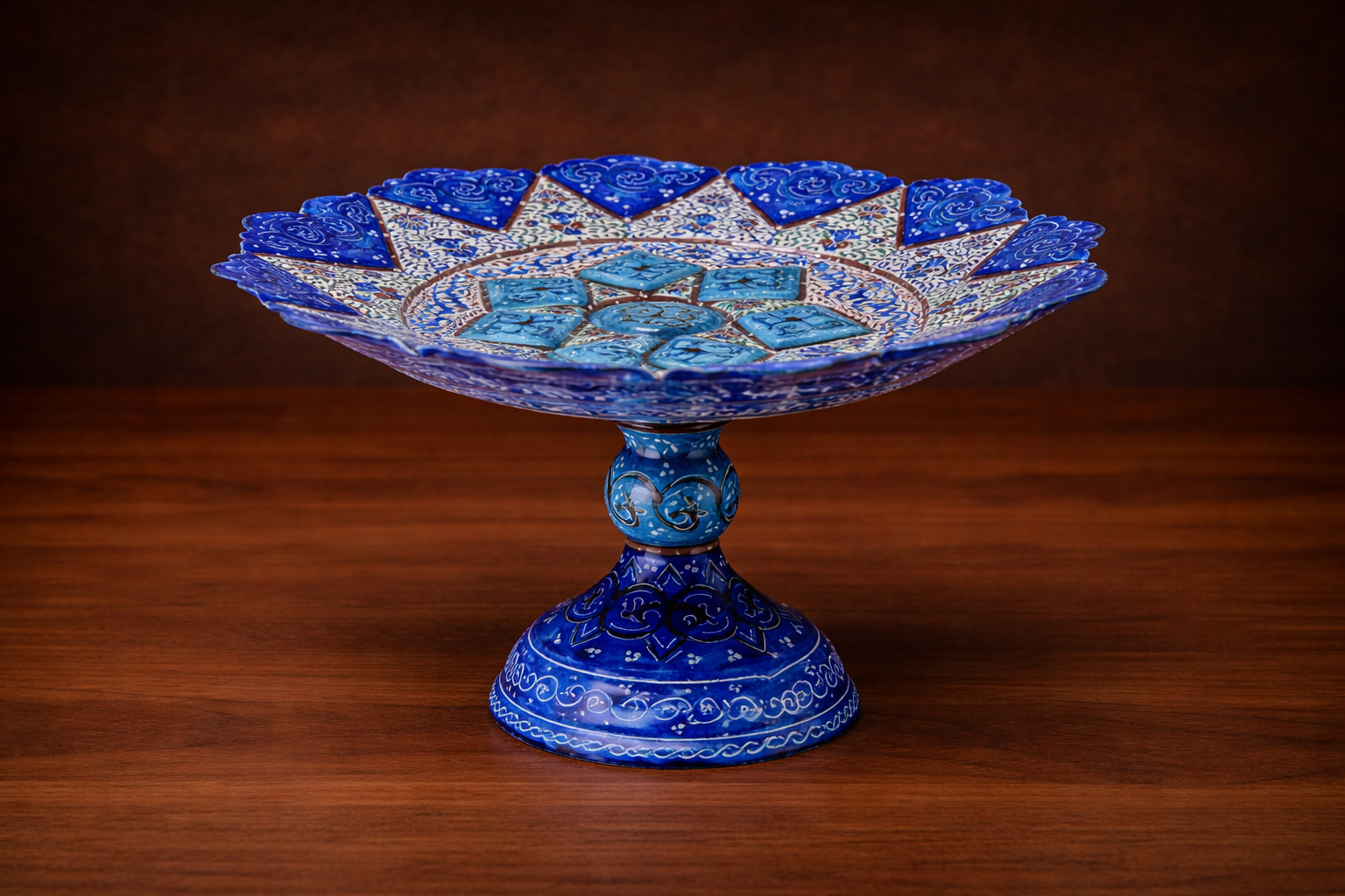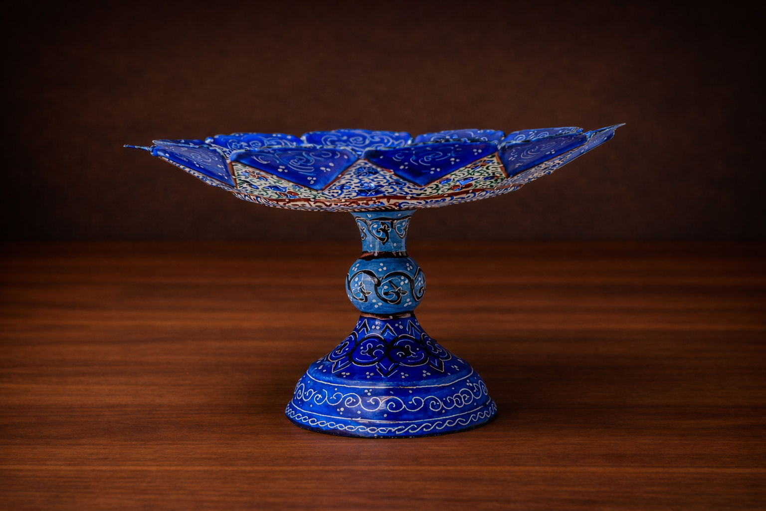 This stunning Enamel (Minakari) Pedestal Stand is a handcrafted Persian artwork, beautifully decorated with intricate floral and geometric patterns in rich shades of blue. Created using traditional Minakari enameling on metal, it combines artistic heritage with everyday functionality. Perfect for presenting fruits, cakes, pastries, sweets, and dates. The raised pedestal design adds elegance to any table setting and it works as a striking decorative display when not in use.