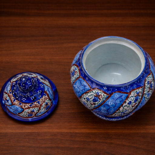 Handmade Minakari enamel copper sugar pot with vibrant turquoise floral detailing and a lidded design, perfect for serving sweets or as an elegant decorative accent.