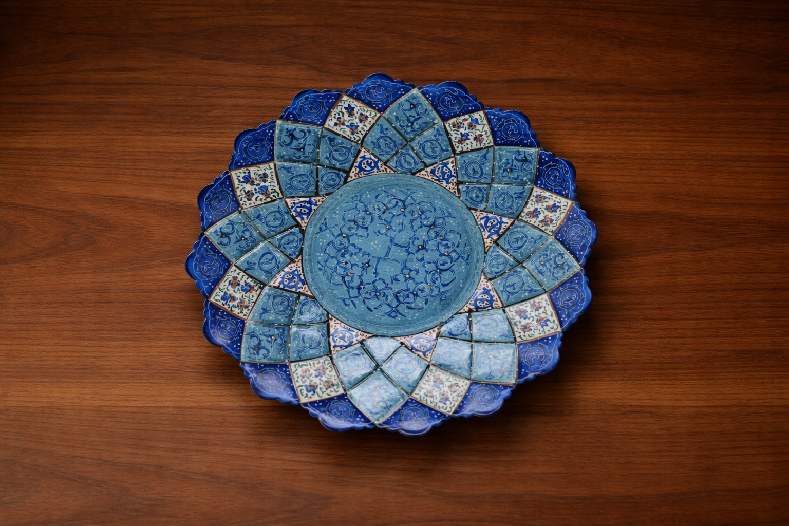 Handcrafted on a pure copper base, the plate undergoes multiple firings up to 750°C to fuse powdered glass enamels, creating a durable, glossy finish that captures nature inspired motifs like blooming petals and geometric elegance. This labor intensive technique, rooted in Sassanian and Safavid traditions, ensures each piece is a unique heirloom blending metallic warmth with heavenly colors.