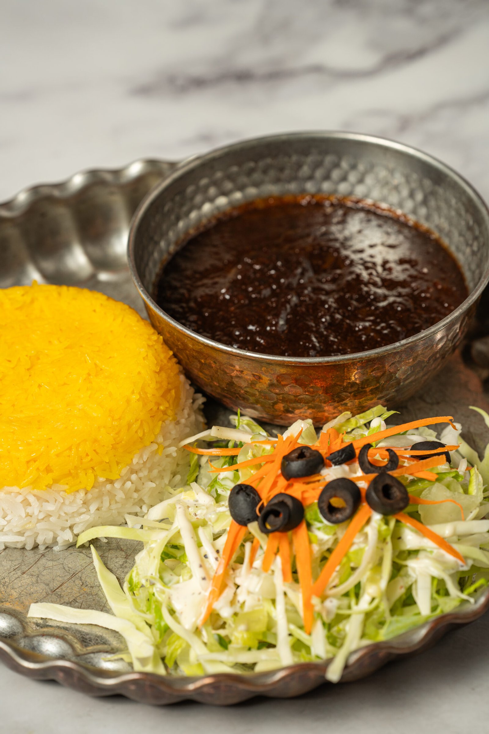 Sweet-and-sour ground walnut stew, enriched with pomegranate molasses and lamb meatballs. Served with aromatic steamed saffron rice and salad.