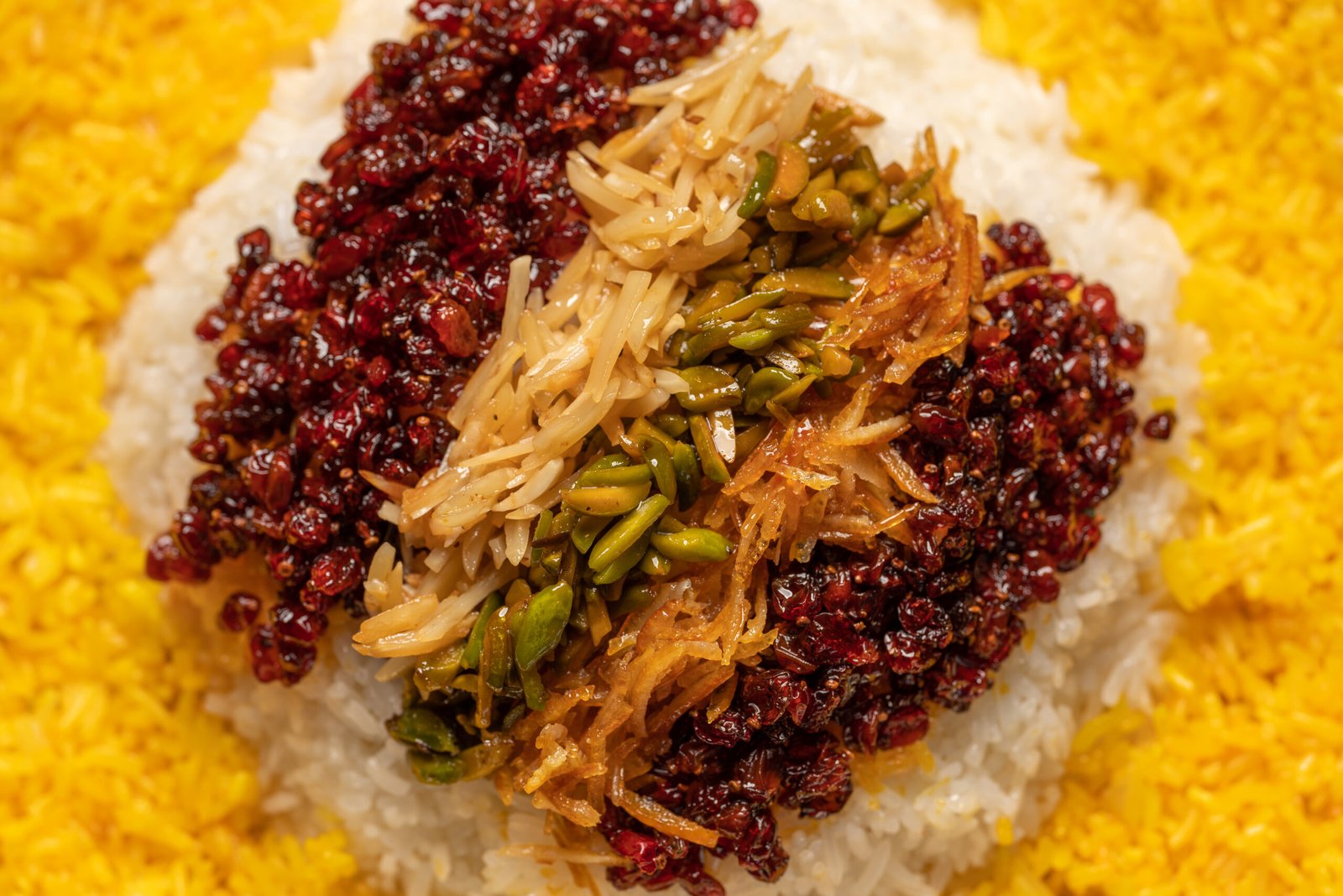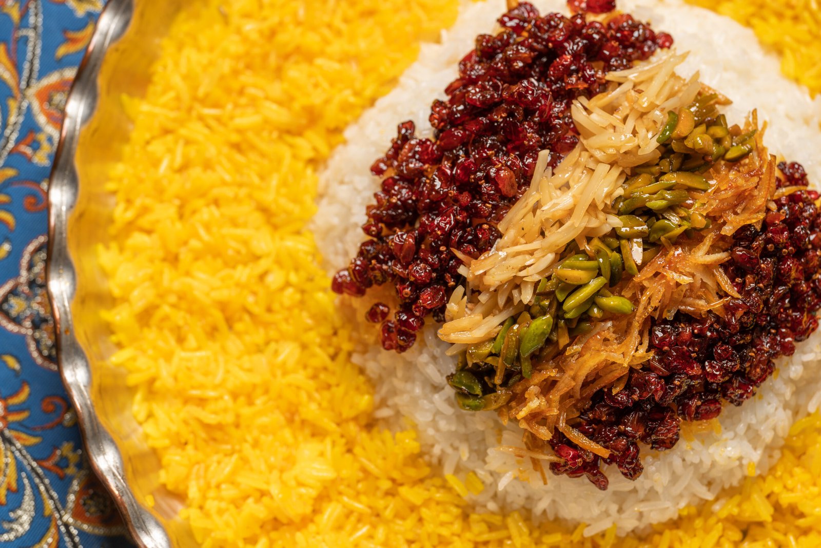 Flavourful beef meat braised with mild spices, served with saffron rice and flavourful toppings of slivered pistachios, almonds, barberries, and sliced orange peel.