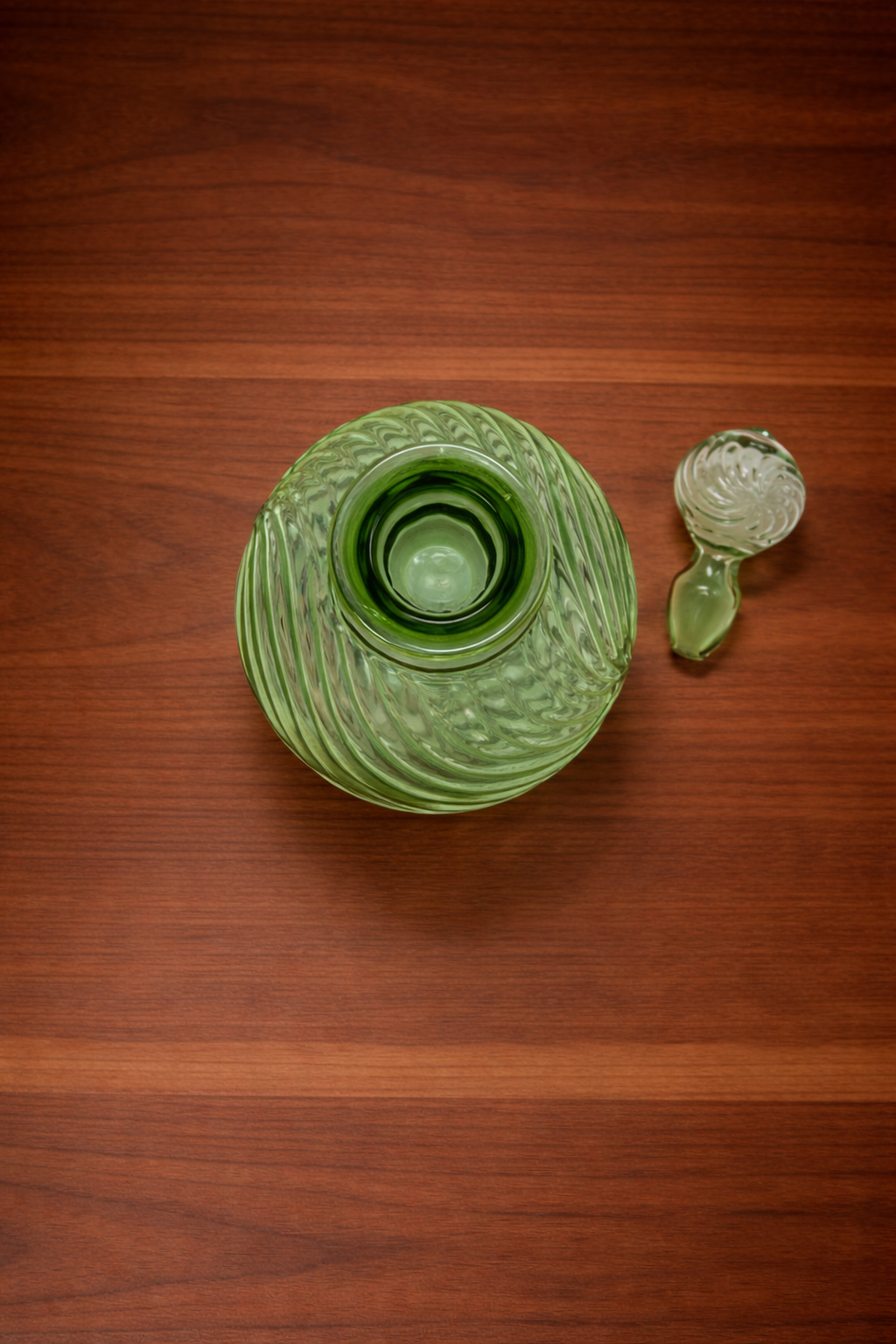 Elevate your table setting with this Green Glass Decanter, crafted with a beautifully sculpted swirl design that catches and reflects light from every angle. The rounded body and elegant glass stopper create a refined silhouette that blends artistry with functionality. Perfect for serving wine, spirits, or infused water, this decanter also doubles as a striking decorative accent for bars, dining rooms, or display shelves.