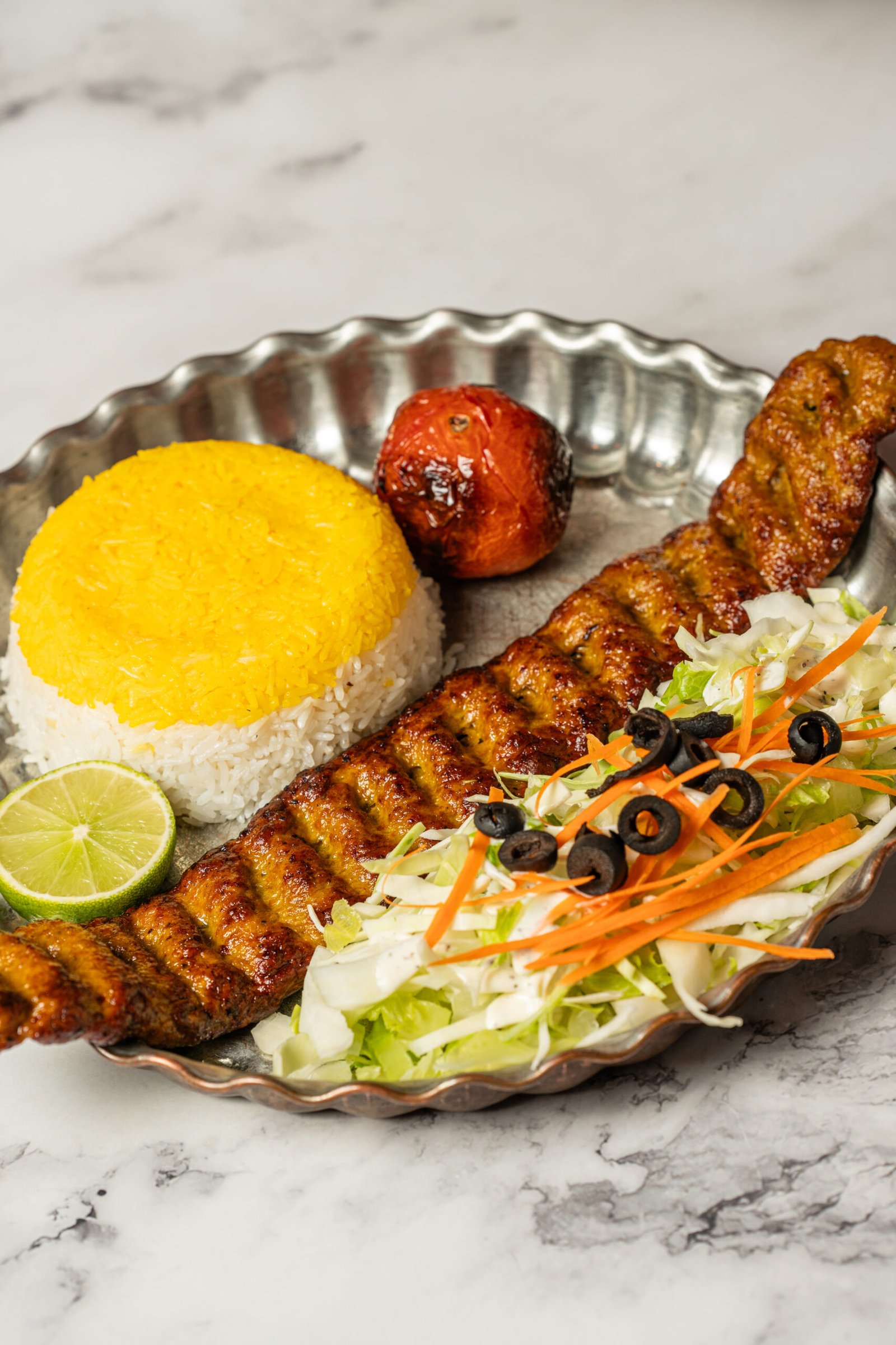 A charbroiled skewer of seasoned ground lamb, served with fragrant saffron rice, a grilled tomato, and a fresh side salad.