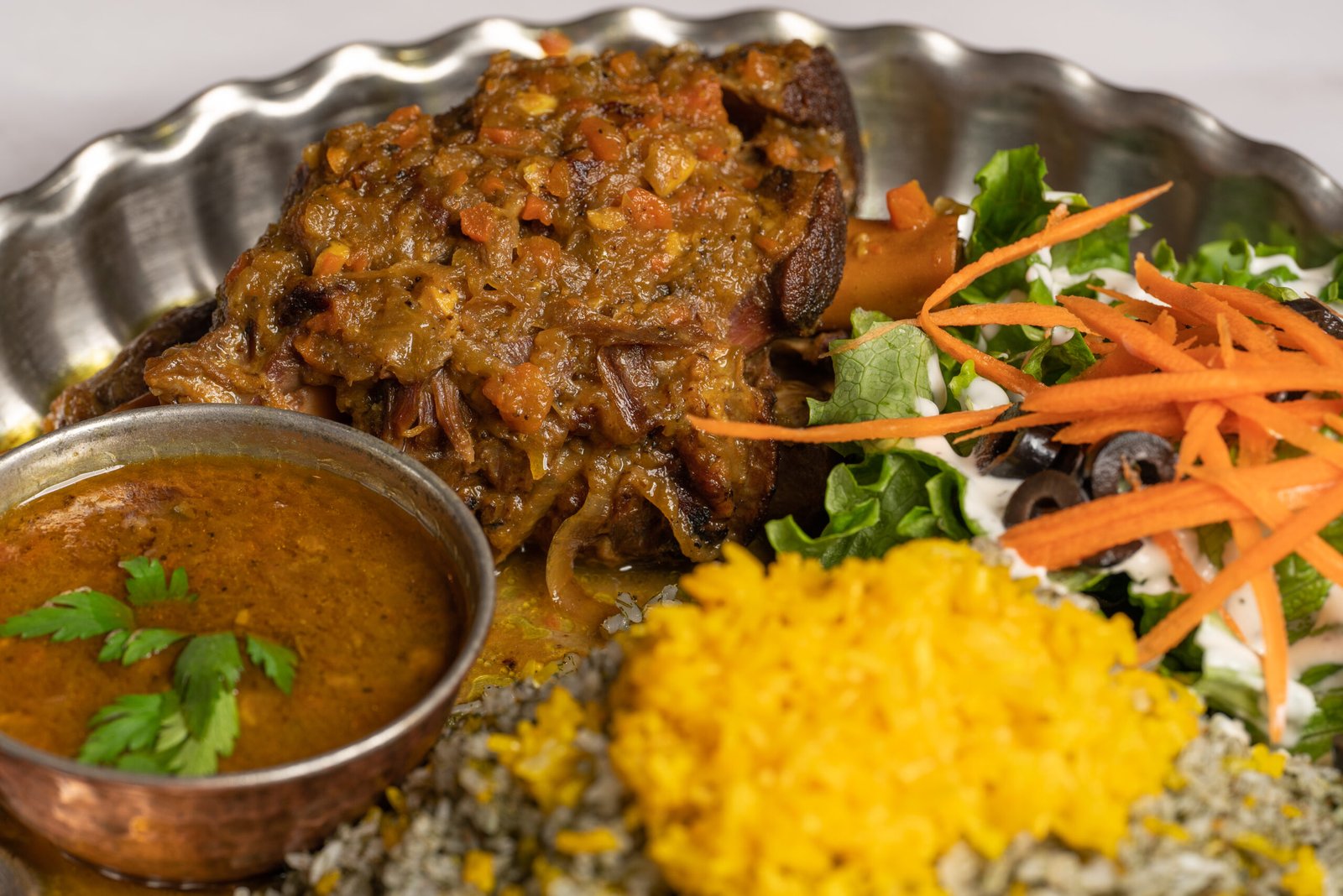 Tender lamb shank slow-cooked to perfection. Served with saffron rice, lamb gravy, and a refreshing salad.