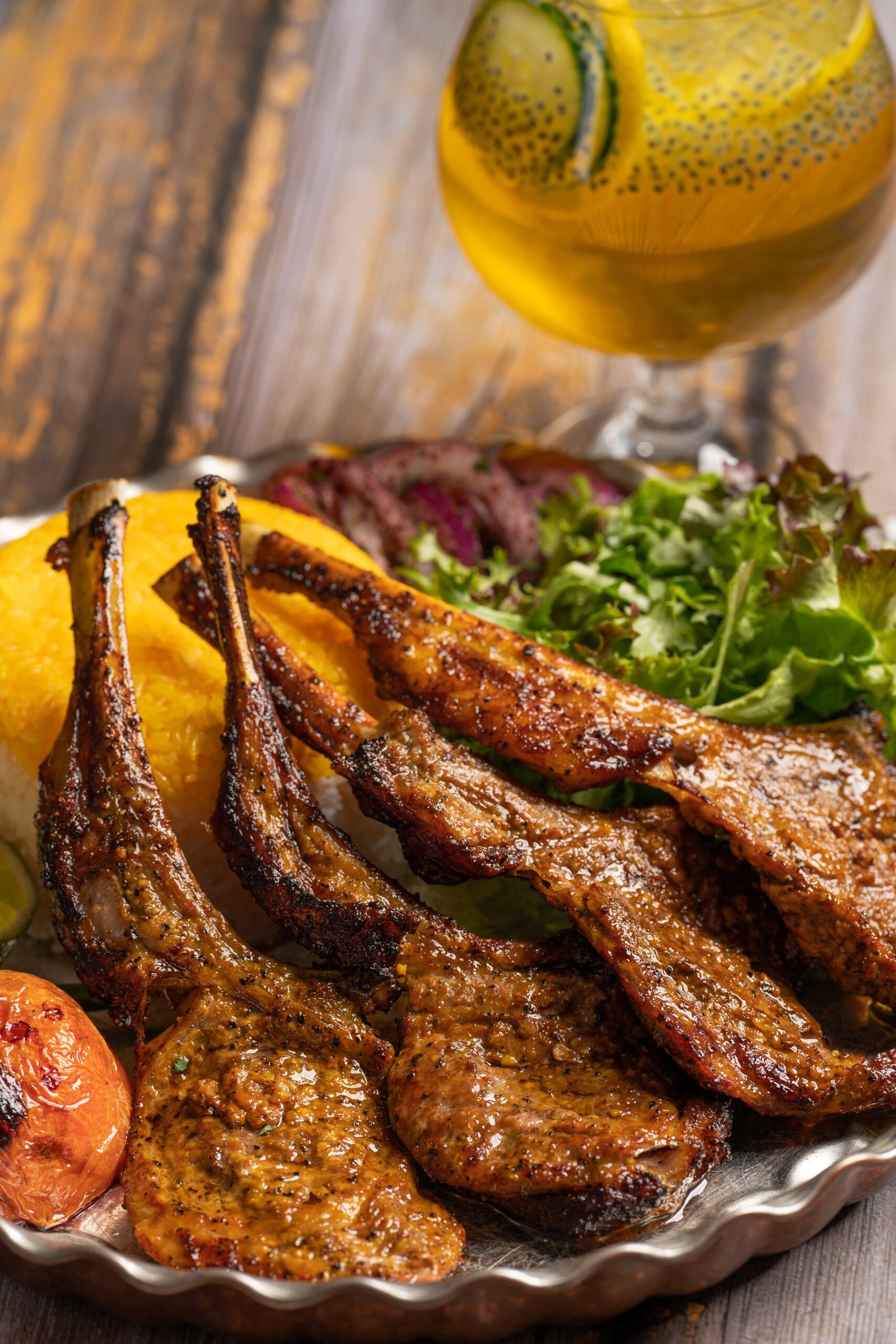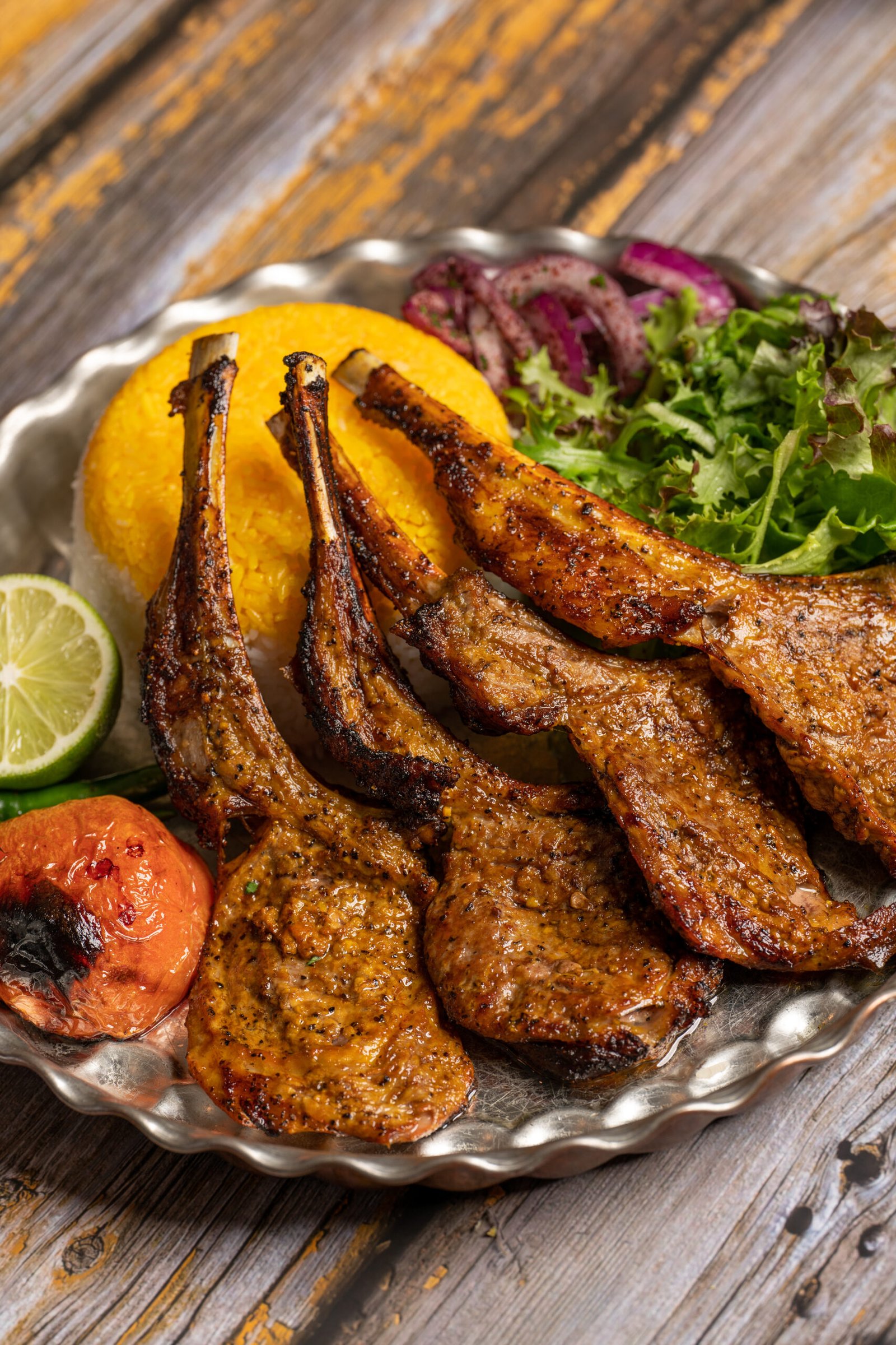 Four pcs of lamb chops, marinated in authentic Persian spices and grilled on a skewer. Served with steamed saffron rice, a grilled tomato, and a fresh side salad.