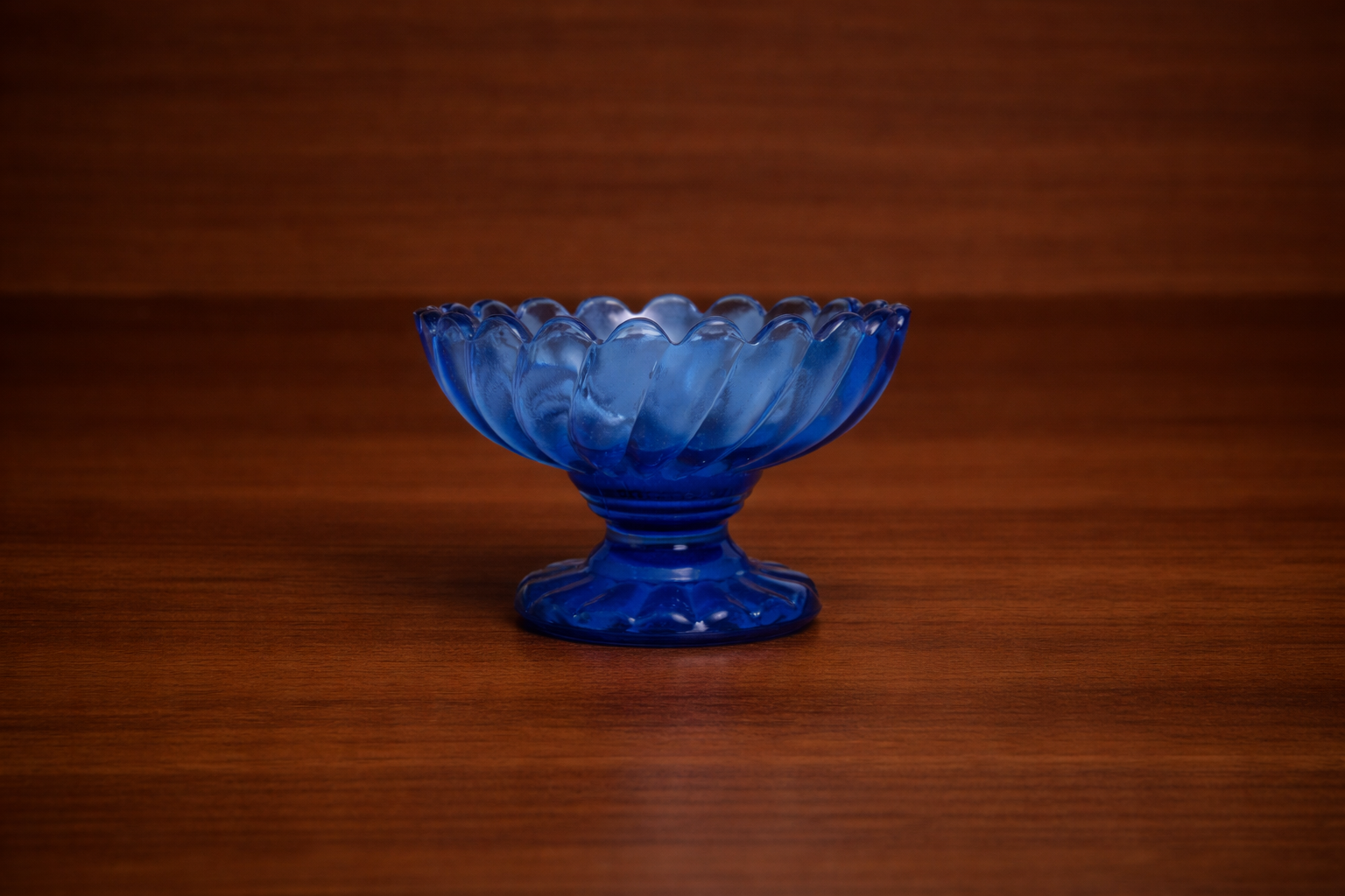 This elegant small blue glass candy bowl features a beautifully scalloped rim and a classic pedestal base that adds charm to any table or display. Crafted from rich blue glass with a soft translucent glow, it’s perfect for holding candies, nuts, desserts, or small decorative items.