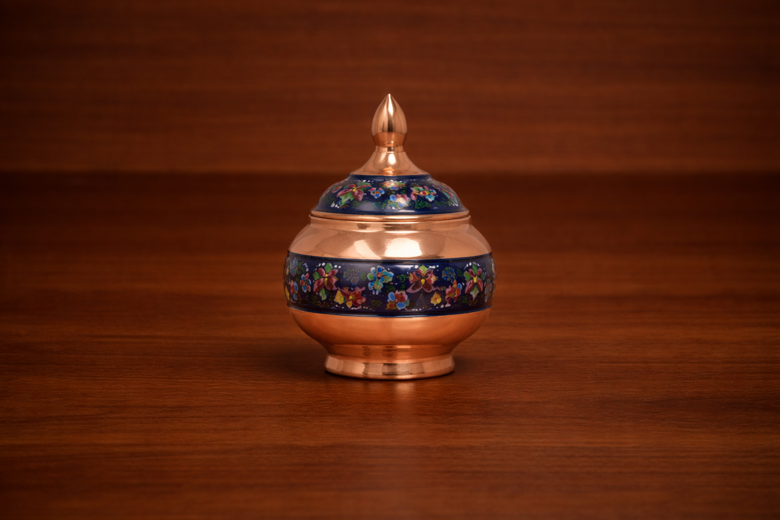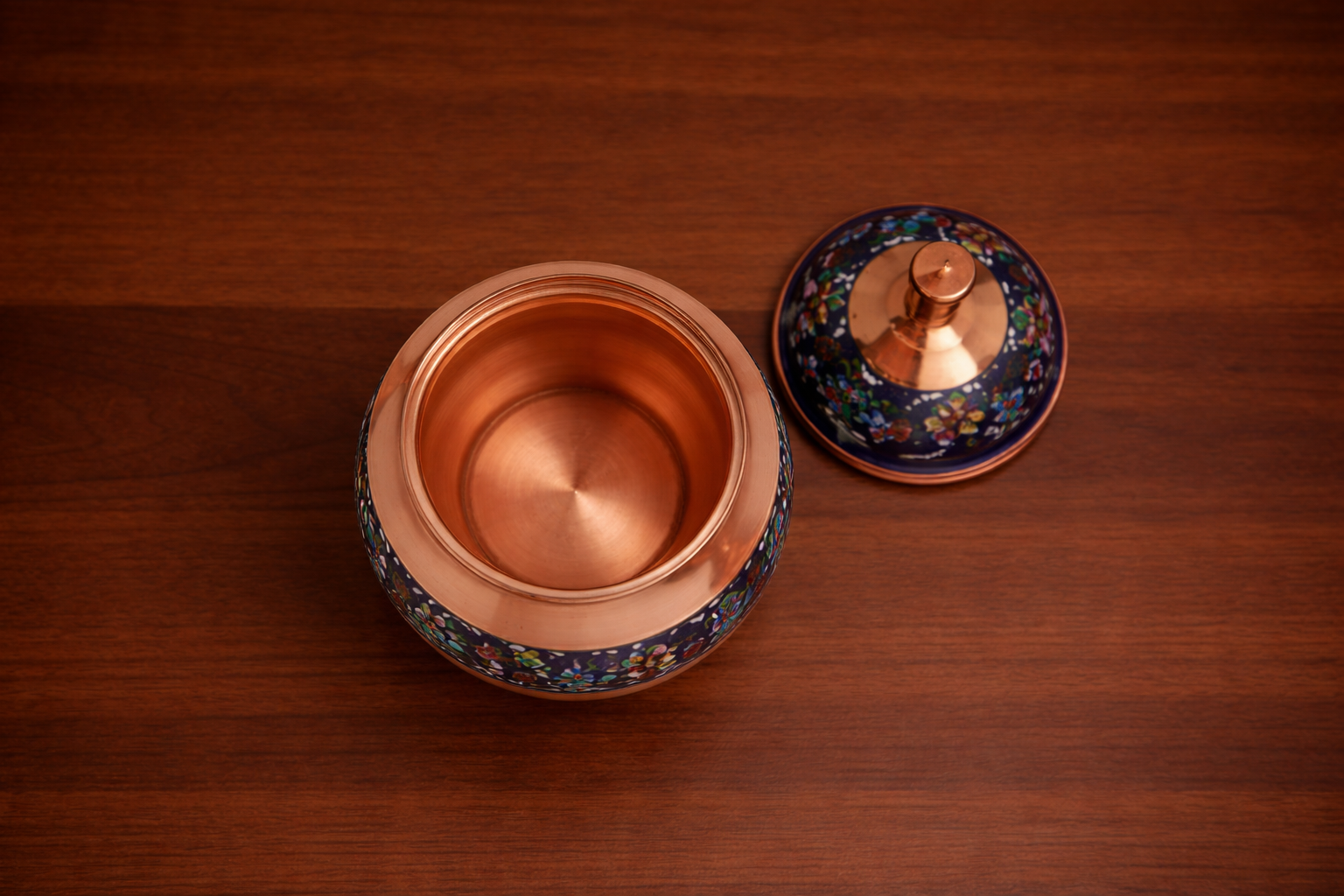 This elegant Minakari copper bowl is handcrafted and hand painted with vibrant Persian floral motifs, finished with a smooth enamel glaze for lasting brilliance. The fitted lid keeps sweets or sugar neatly stored while adding a refined decorative touch to your table or display shelf.