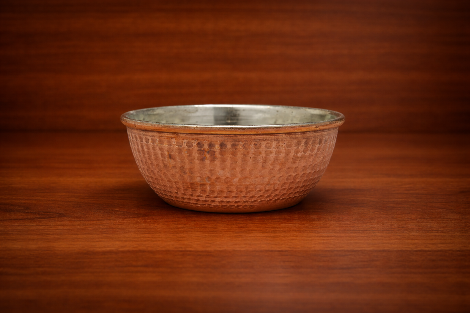 This elegant Small Hammered Copper Bowl is a beautifully handcrafted piece featuring a rich textured finish that highlights the natural warmth of copper. Designed for both everyday use and decorative display, it combines traditional craftsmanship with modern functionality. Safe for hot foods, this versatile bowl is perfect for serving warm soups, sauces, curries, nuts, sweets, dips, olives, and snacks. Its durable metal construction retains heat well while adding rustic charm to any table setting.