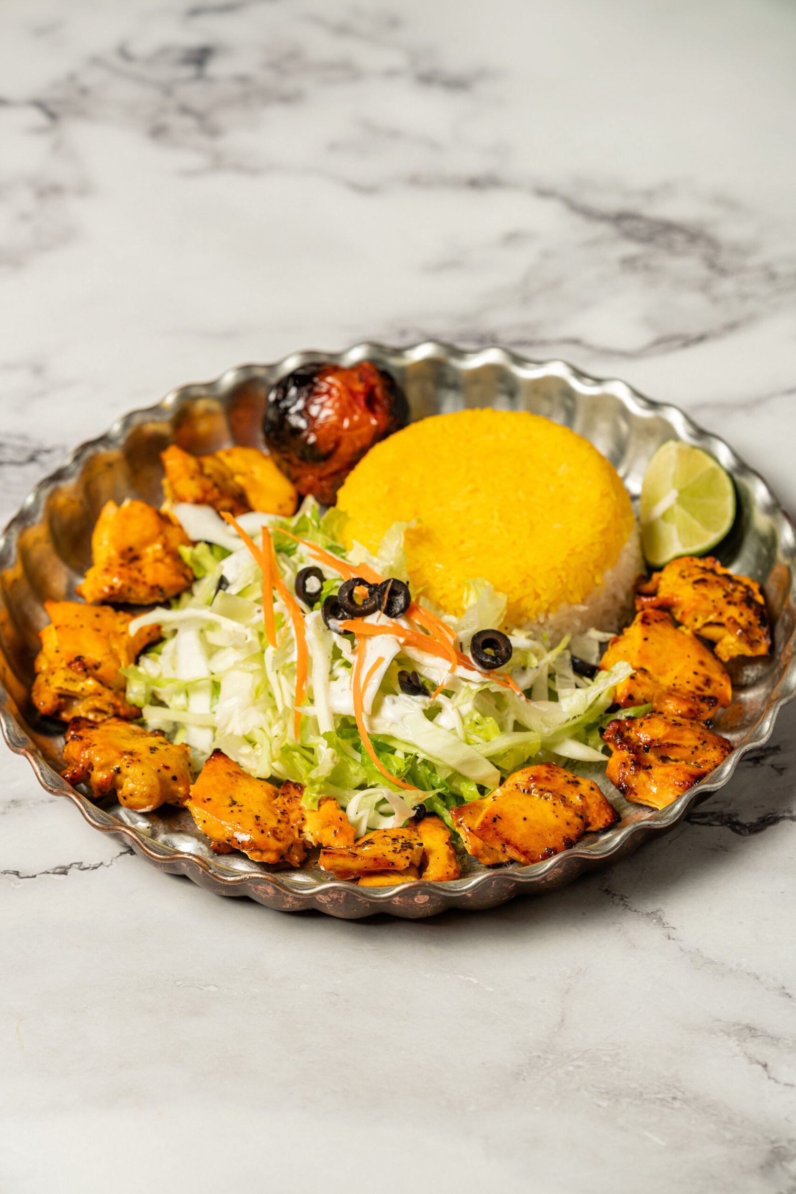 Juicy chicken thighs marinated in herbs and the chef’s special sauce, with a smoky tangy flavor. Served with saffron rice, grilled tomato, and fresh salad.