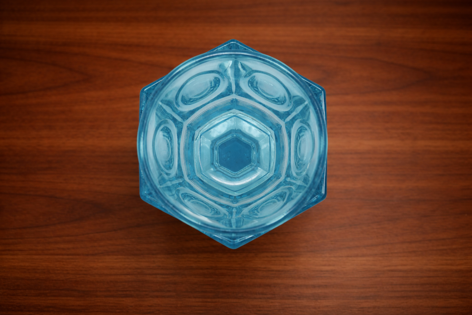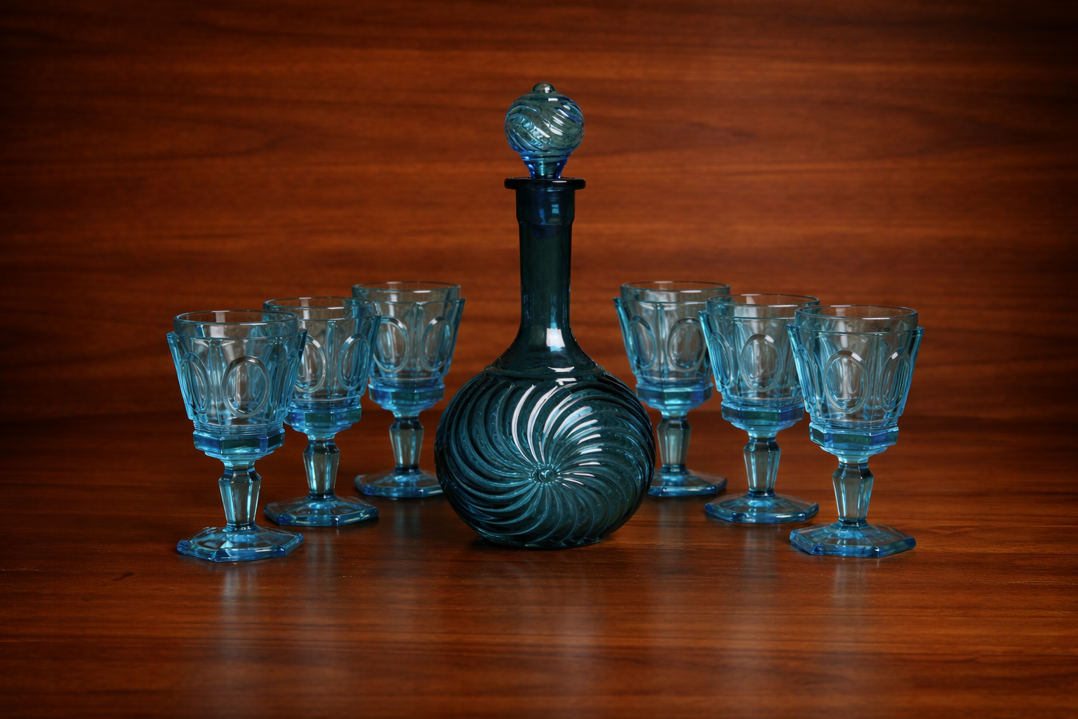 This stunning Turquoise Glass Decanter Set with 6 Stemmed Goblets brings refined beauty and vintage charm to your drinkware collection. Featuring a beautifully sculpted turquoise glass decanter with a decorative swirl design and matching stemmed goblets, this set is both functional and visually striking. Perfect for serving wine, spirits, cocktails, water, or specialty drinks, the rich turquoise tone catches the light beautifully, creating an eye catching centerpiece for dinner parties, celebrations, or home bars. Whether used for entertaining or displayed as décor, this set adds sophistication and color to any space.